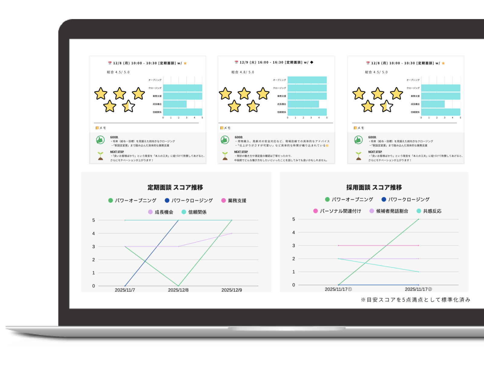 全ての面接に同席せずとも、定期レポートで「誰がどのような面接をしているか」を把握し、的確に指導できるようになりました。